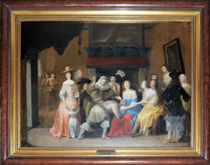 Die Zuschreibung am Hieronymus Janssens stützt sich auf ein fast identisches und signiertes Gemälde, das bei Hampel in München am 29. Juni 2023 versteigert wurde bzw. auf ein dort als Vergleich zitiertes Gemälde in einem Londoner Museum mit folgender Beschreibung: "Hieronymus Janssens, also known as “Den danser", 1624 Antwerp - 1693 ibid. ELEGANT PARTY IN AN INTERIOR, PLAYING “LA MAIN CHAUDE” Oil on canvas. Relined. 58 x 83 cm. Signed “H. Janssens. fecit” lower left.