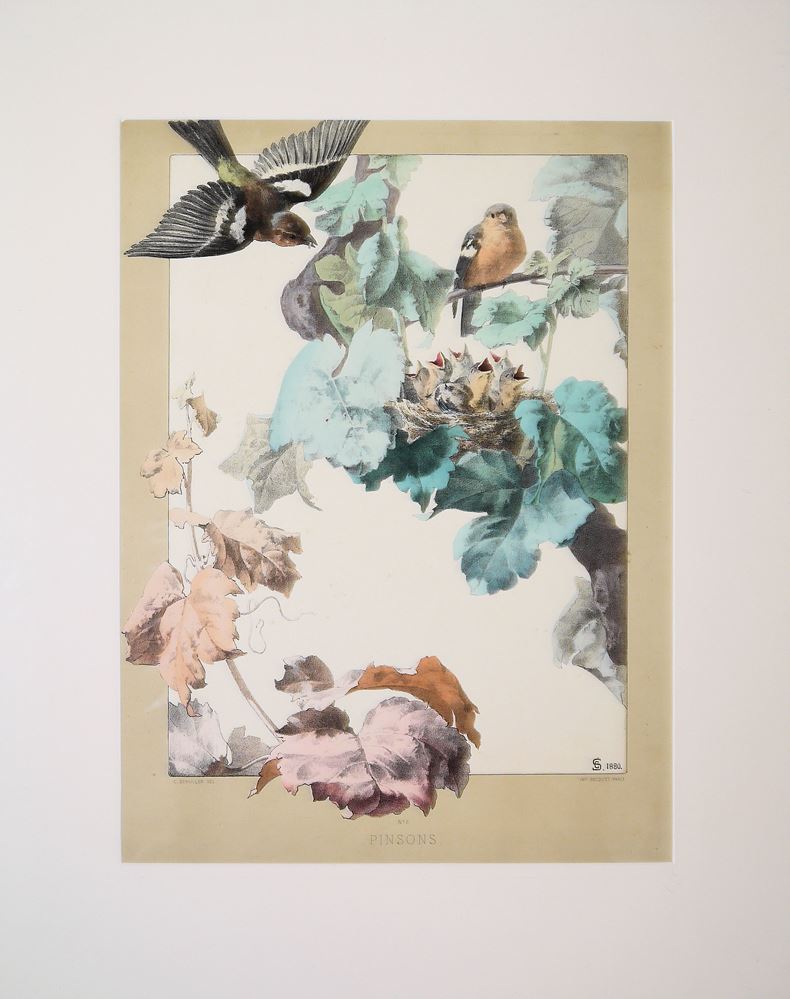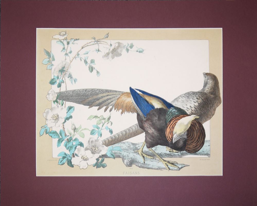 0514-J. C. Schuller, Becquet imp.: “Perroquet”, “Pinsons” & “Faisans”, 3 große Farblithographien um 1880 aus “Oiseaux” & Joseph Nigg, Blumenbukett mit Weintrauben, große Chromolithographie, Fernand Mourlot