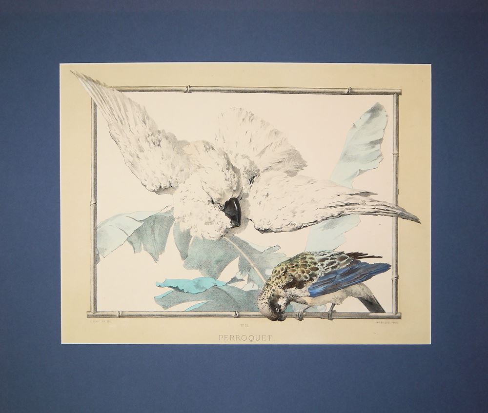 J. C. Schuller, Becquet imp.: "Perroquet", "Pinsons" & "Faisans", 3 große Farblithographien um 1880 aus "Oiseaux" & Joseph Nigg, Blumenbukett mit Weintrauben, große Chromolithographie, Fernand Mourlot