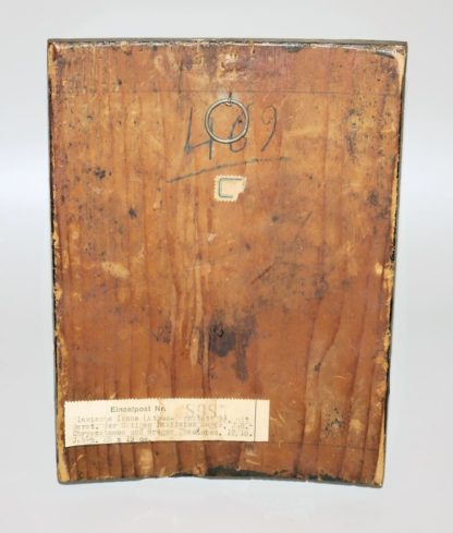 Die drei Kirchenväter Basilius "der Große", Johannes Chrysostomos und Gregor von Nazianz "der Theologe", fein gemalte Porträts, über den Figuren griechisch bezeichnet, Tempera auf Gold und Holz, rückseitig altes Klebeetikett, ohne Sponki, 25 x 19 cm