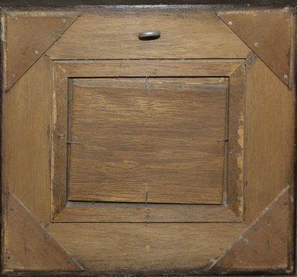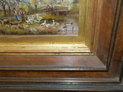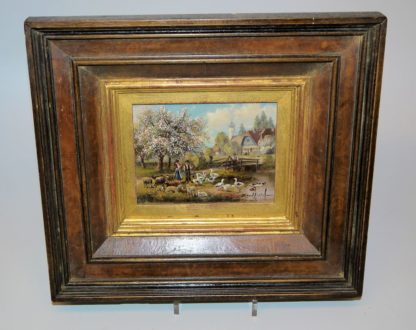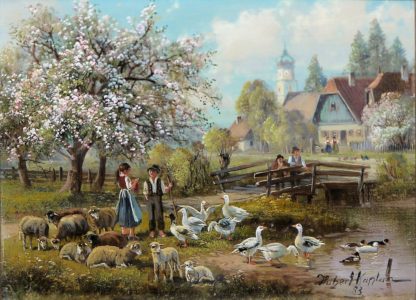 Hubert Kaplan, *1940 München, Kunstmaler im Duktus naturalistischer Feinmalerei, hier: Bäuerliche Szene am Rande eines Dorfes im Frühling, eine junge Gänsemagd und ein Schafshirte unterhalten sich inmitten ihrer Tiere vor einem üppig blühenden Baum. Im Hintergrund angeln zwei Männer auf einer Brücke, bevor der Blick auf das Dorf mit Kirchturm fällt, Öl/Platte, 9 x 12 cm, signiert, datiert (19)83, gerahmt