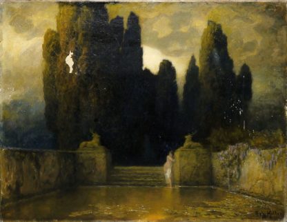 Ferdinand Keller, später Ferdinand von Keller, 1842 Karlsruhe - 1922 Baden-Baden, deutscher Genre- und Historienmaler. Er ließ sich von Themen aus der antiken Mythologie inspirieren und schuf Bilder einer unheimlichen Anderswelt, hier: Die antike Lyrikerin Sappho als leicht bekleidete Nymphe auf der Treppe eines barocken, ummauerten Seerosenteiches stehend. (Ein fast identisches Gemälde unter dem Namen "Sappho" wurde von Ferdinand Keller bereits schon einmal 1909 gemalt. s. Dorotheum, Auktion April 2024), Öl/Lw., 72 x 54 cm, ein 5 x 2 cm großer Farbverlust in einer der linken Zypressen sowie div. kleinere Verlust- "Schlieren" rechts, r. u. sign. u. dat. 1916