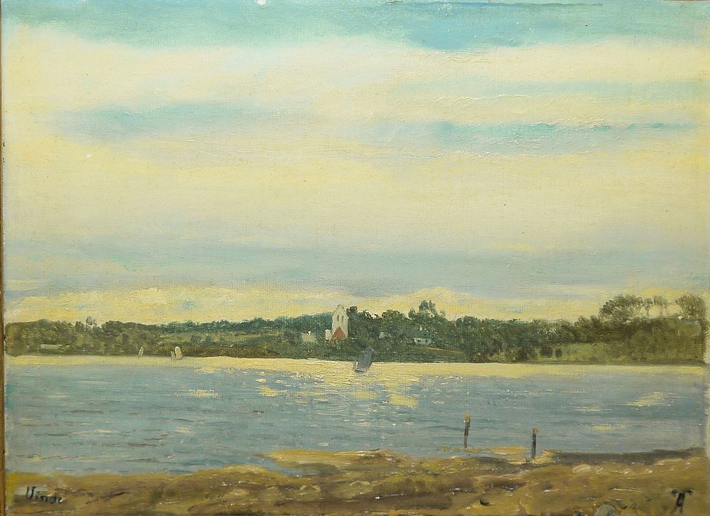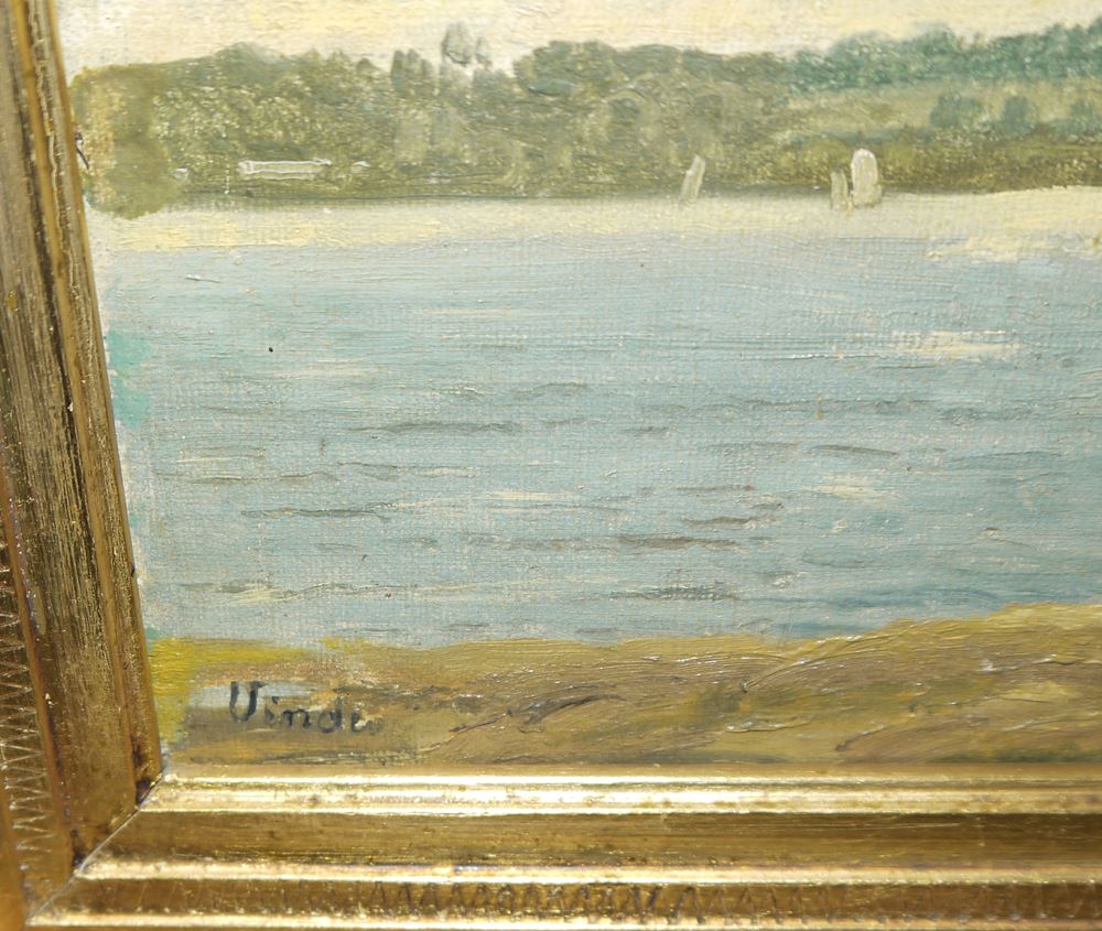Anton Thorenfeld, 1839 Svendborg - 1907 Kopenhagen, dänischer Landschaftsmaler & Opernsänger, hier: Blick über ein Gewässer mit Segelbooten auf einen grünen Küstenstreifen mit Häusern, l. u. bez."Vinde", ein Ortsteil der dänischen Stadt Skive., Öl/Holz, 23,5 x 31 cm, r. u. monogr., verso sek. bez. Anton Thorenfeldt mit Monogramm, Lebensdaten und der Ortsbezeichnung "Vinde V.Skive", im Goldstuckrahmen mit graviertem Namensschild