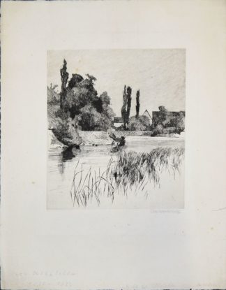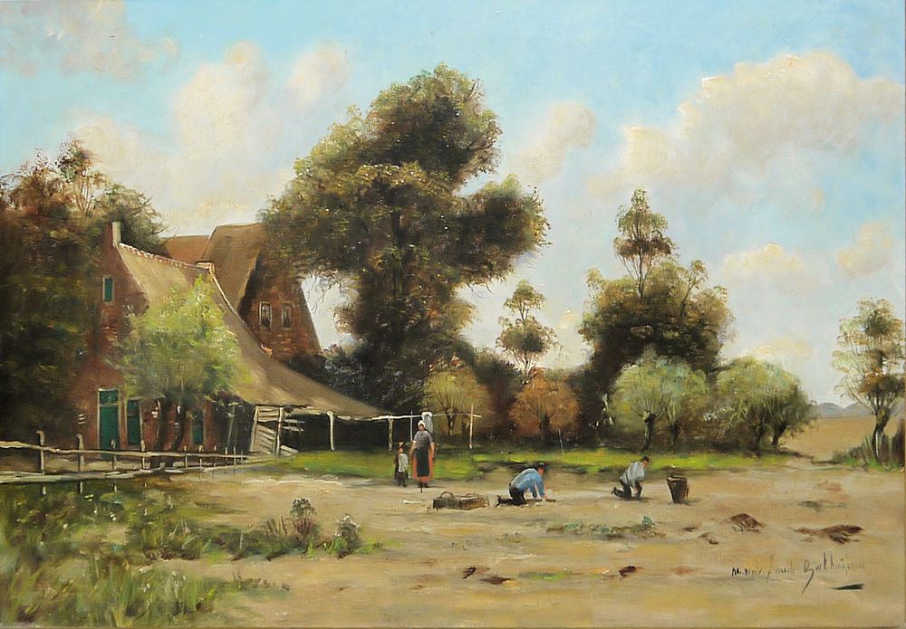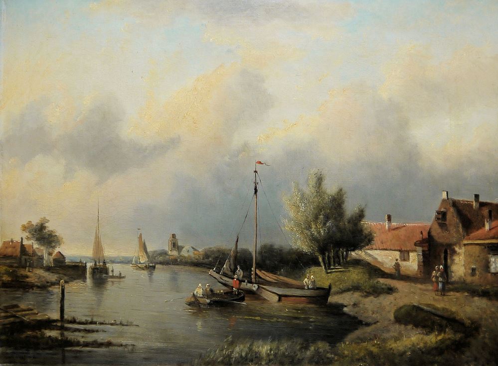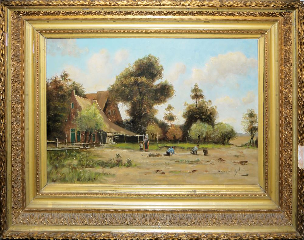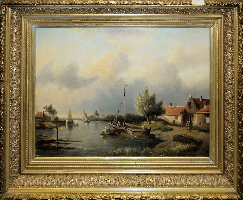 Ch. Go...(?), Gehöfte an einem Gewässer mit Segelbooten und Menschen, Öl/Lw. altdoubliert, 46 x 65 cm, l. u. sign., im wohl originalen Goldstuckrahmen (Gesamt: 68 x 86 cm) // Rinkhuizendaal o.a., Bäuerliches Anwesen mit erntenden Personen, Öl/Lw., 40 x 60 cm, r. u. sign., im breiten, wohl originalen Goldstuckrahmen (Gesamt: 62 x 82 cm)