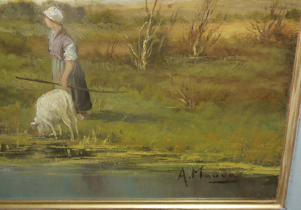Anton Mauve, Schäferin mit Schafen an der Tränke, Ölgemälde, gerahmt Anthonij oder Anton Mauve, 1838 Zaandam - 1888 Arnhem, niederländischer Landschaftsmaler der Haager Schule. Er wurde anfänglich als Maler von Tierszenen, vor allem als Schafmaler, bekannt, hier: Abendstimmung über einer weiten Landschaft. Eine junge Schäferin hat ihre Tiere zum Tränken an ein Gewässer geführt, Öl/ Holz, 40 x 50 cm, r. u. sign., gerahmt Zum Künstler: Von 1854 bis 1857 ging Anton Mauve bei dem Tiermaler Pieter Frederik van Os (1808-1892) in die Lehre. Dort wurden Tiere, besonders Schafe, aber auch Kühe und Pferde sein bevorzugtes Thema. Anschließend blieb er für einige Monate bei dem Pferdemaler Wouterus Verschuur. Anton Mauve gehörte dem Künstlerkreis der Haager Schule an. Seine Malerei kennzeichnet die Vorliebe für ganz schlichte Motive, weite melancholische Heidelandschaften mit Schafen, Pferden und Kühen dominieren seine Arbeit. Als Inspiration dienten Mauve die Arbeiten der französischen Künstler in Barbizon, vor allem wurde er von den Werken des Franzosen Jean-François Millet beeinflusst, der wie Mauve Landschafts- und Schafsbilder malte.