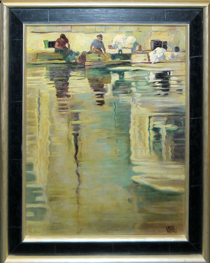 Otto Vittali, Wasserspiegelung, Ölgemälde, gerahmt Otto Vittali, 1872 - Offenburg - 1959, Wasserspiegelung, Öl/Lw./Platte, ca. 34 x 27 cm, signiert, verso Etikett Zum Künstler: Sohn des Fabrikanten Otto Hermann Leopold Vittali (1840-1911), dessen Vorfahren 1804 aus Bellano in der Lombardei nach Deutschland eingewandert waren. Studium an der Kunstakademie Karlsruhe und der Kunstakademie München. Er unternahm eine große Studienreise nach Amerika. Im Auftrag von Kaiser Wilhelm II. entwarf er die Deckenmalereien für die Himmelfahrtkirche auf dem Ölberg in Jerusalem.