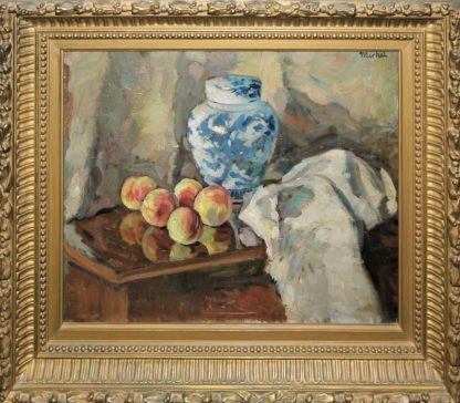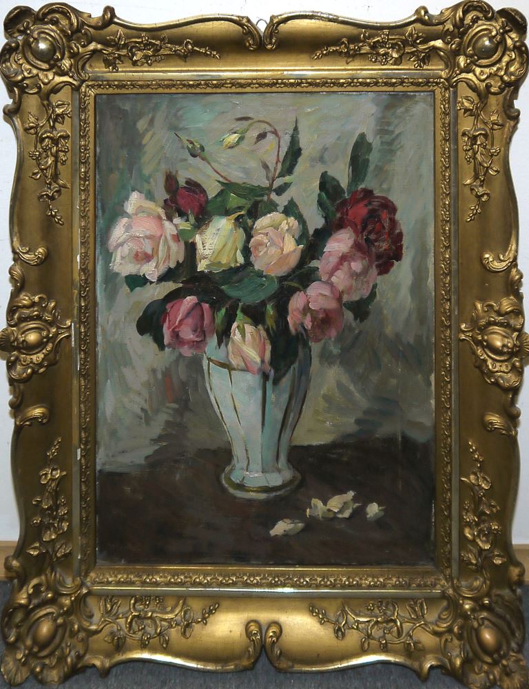 Heinrich Merkel, Stillleben mit Pfirsichen & Pfingstrosenstrauch, zwei Ölgemälde um 1915 in originalen Goldstuckrahmen, dazu Joseph August Beringer, Charakterporträt, Farbkreide von 1920, gerahmt