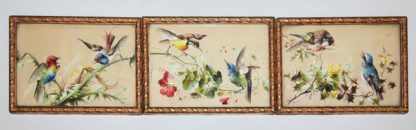 Miniaturist, drei Feinmalereien farbenfroher Singvögel, Gouachen um 1900 Serie dreier kleinformatiger Malereien mit Vogelpaaren auf Pflanzen, Wasserfarbe auf Papier, je 10 x 15 cm, artgleich unter Glas gerahmt, ein Bild geöffnet und am linken Rand gering angerissen, ohne Signatur