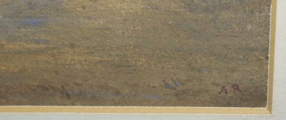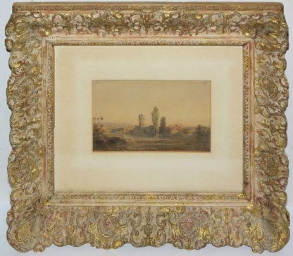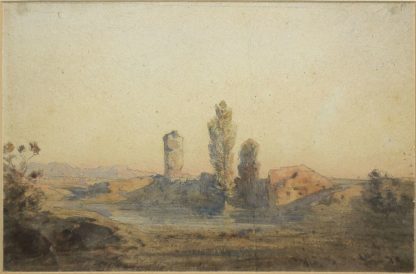 A.R. Monogrammist um 1780/1800, Morgenstimmung über einer Campagna- Landschaft bei Rom mit antiken Ruinen, im Hintergrund ein Aquädukt vor einer sanften Hügelkette, Aquarell, alte, wenig störende, vertikale Knickfalte, ca. 15 x 25 cm, r. u. monogrammiert, unter P.partout in edler Stilrahmung