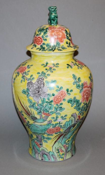 Balustervase mit Deckel, vor gelbem Fond ein Fasanenpaar an Felsen und Blumen, Boden und Kopf des Fu-Hundes mit Vorbohrung für Lampenstange, H 52 cm