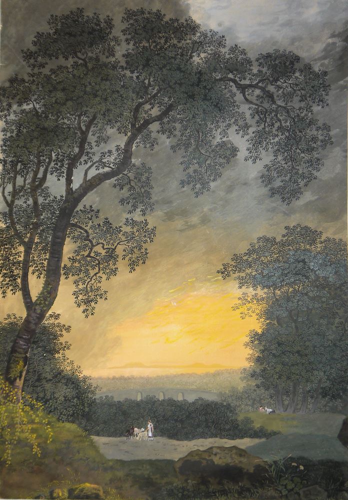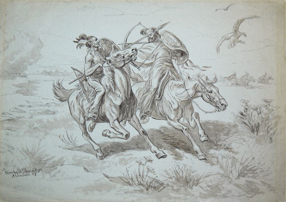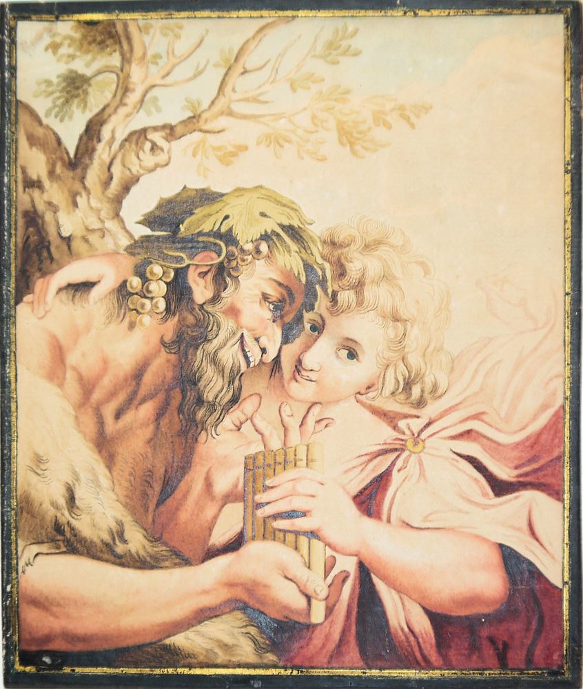 Sammlungsnachlass mit 5 Zeichnungen, Aquarell und Gouache, dabei Reinhold Schweitzer, nach Guiseppe Maria Mitelli u.a., 17.-20. Jh. Reinhold Schweitzer, 1876 - 1940, Maler und Grafiker in München, Indianer und Cowboy, Tuschzeichnung, 29,5 x 41 cm, sign., dat. 1927 u. bez. München; Giuseppe Maria Mitelli, 1634-1718, italienischer Maler u. Kupferstecher des Barock, nach seiner Radierung "Scharlatan auf der Bühne, eine Schlange haltend", Rötelzeichnung, 27 x 12,5 cm; Anonym, "bey Sindelsdorf August 1820", Landschaft, Bleistiftzeichnung, 25 x 38,5 cm, bez. u. dat., unter P.p.; Romantische Landschaft bei Sonnenuntergang, Gouache, 57 x 38 cm; Pan mit jungem Mädchen, Tusche und Aquarell, 18 x 16 cm, unter P.p.