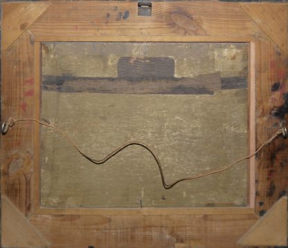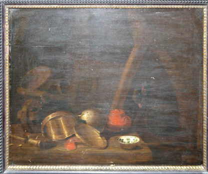 Floris Gerritsz van Schooten oder Floris van Schooten, zwischen 1585 /1588 - 1656, Schule/ Nachfolge, Blick über blitzende Messingtöpfe/ -pfannen, einen rot emaillierten Kessel u.a. Küchengerät in einen Küchenraum, in dem im Mittelgrund ein Mann an einem Fass hantiert, Öl/ auf allseitig gefaster Eichentafel, 30 x 38 cm, in Rahmung des 19. Jhs. Eine Abtragung des eingetrübten Altfirnis und eine Reinigung sind empfehlenswert