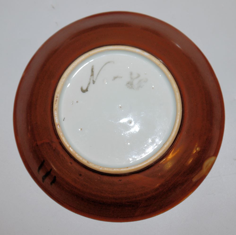 Sechs Teeschalen (H ca. 3,8 cm) mit zugehörigen Untertellern (Dm ca. 11,8 cm), Blauweiß-Porzellane mit kaffeebrauner Außenwandung, ein Teller unterseitig mit Tintennummer "N:80", ein Tellerchen am Rand geklebt, zwei Koppchen mit Haarriss, ansonsten intakt, dazu zwei Blauweiß-Schälchen mit den drei Glücksgöttern Fu-Lu-Shou (H ca. 4 cm), alle Teile ungemarkt
