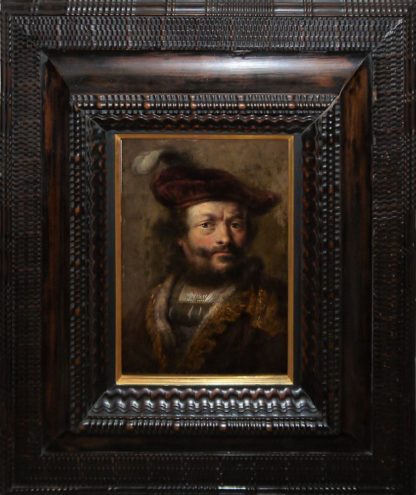 Rembrandt Harmenszoon van Rijn (1606 Leiden - 1669 Amsterdam), Werkstatt/ Nachfolge, Porträt des Rembrandt mit dem Federbarett, sehr qualitätvolle Malerei auf Zinkblech mit "gewachsener", ehrlicher Patinierung" (Rückseite), 26 x 20 cm, frisch gereinigt, im wohl originalen, altniederländischen Rahmen