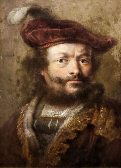 Zum Gemälde: Das vorliegende Porträt ist die seitenverkehrte, fast detailtreue Wiedergabe der Rembrandt- Radierung "Selbstbildnis mit dem Federbarett" aus dem Jahr 1638 (Bartsch 20 (B. 20) bzw. New Hollstein 170 III). Da Radierungen in der Regel oft seitenverkehrte Umsetzungen von Originalen sind, sind in diesem Fall nur zwei Erklärungen möglich: Entweder haben wir es mit einem Original, von wem aus immer gemalt (Govaert Flinck ?), zu tun, an dem sich die Radierung- die heutzutage von manchen Forschern auch dem Govaert Flinck zugeschrieben wird - orientiert hat oder aber um eine nachträgliche Wiederumkehr der Radierung in ein Original, quasi als ehrende, etwas spätere Reminiszenz "an den großen Meister. Für eine Reminiszenz spricht auch das Maß des vorliegenden Gemäldes. Es ist fast exakt doppelt so hoch und breit wie die Radierung (Plattengröße von 13,6 x 10,4 cm).
