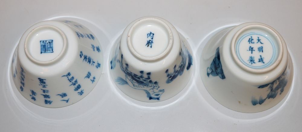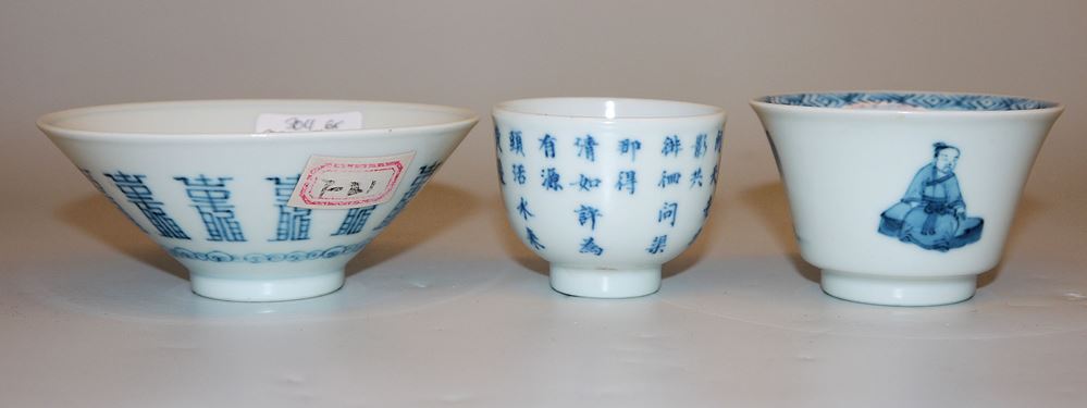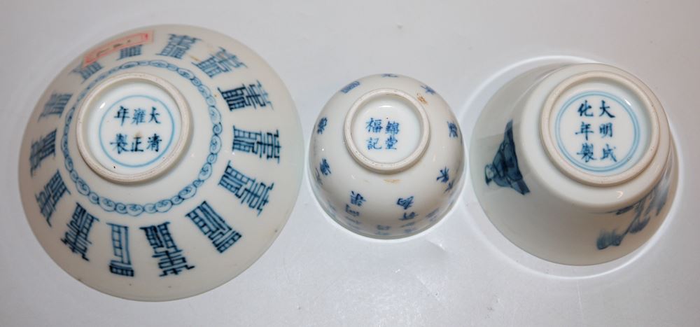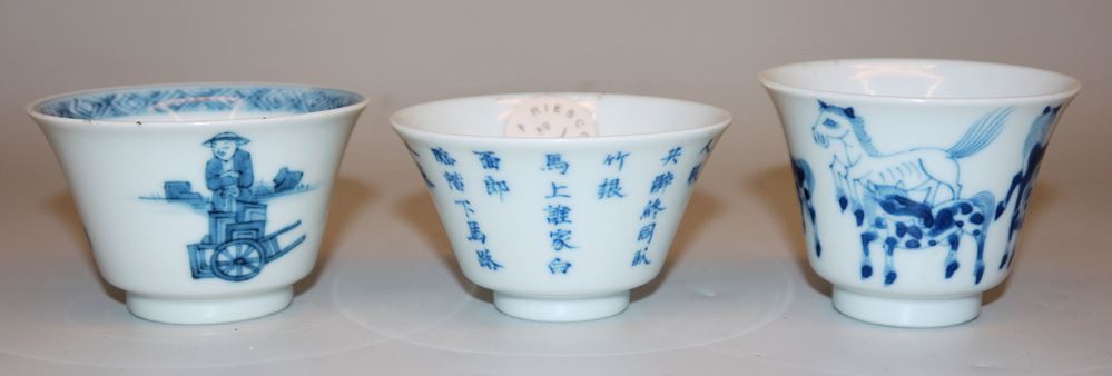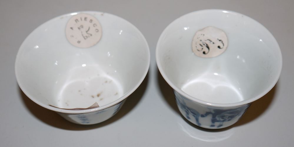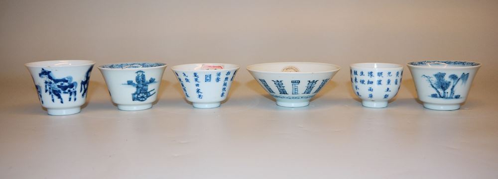 Sechs Blauweiß-Koppchen der Qing-Zeit, China 18. Jh. Sechs kleine Teeschalen, drei davon mit Kalligraphie, zwei gleiche Schalen mit Landschaft und Figuren sowie eine Schale mit Pferden, unterschiedlich gemarkt (Chenghua, Yongzheng bzw. mit Hallenmarken), z.T. mit Sammlungs-Etiketten (Riesco, Oriental Ceramic Socy. u.a.), alle intakt, H 4 - 4,2 cm, Dm 4,9 - 9,2 cm