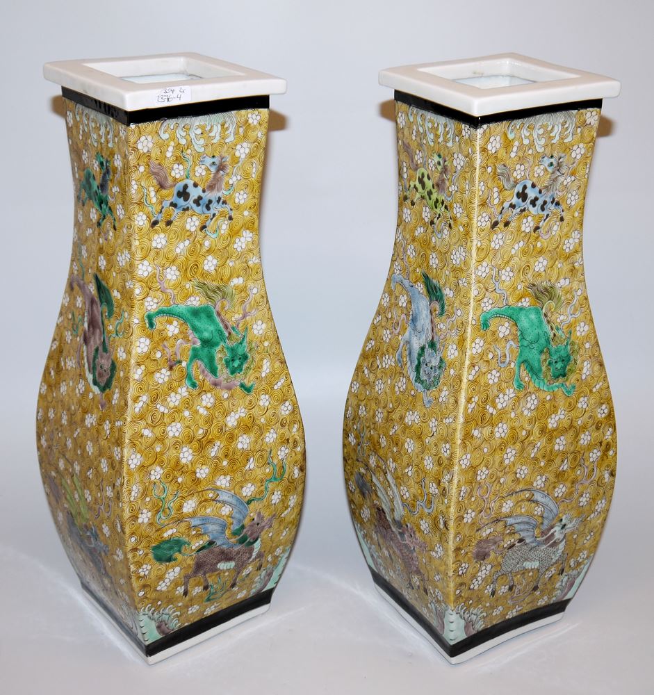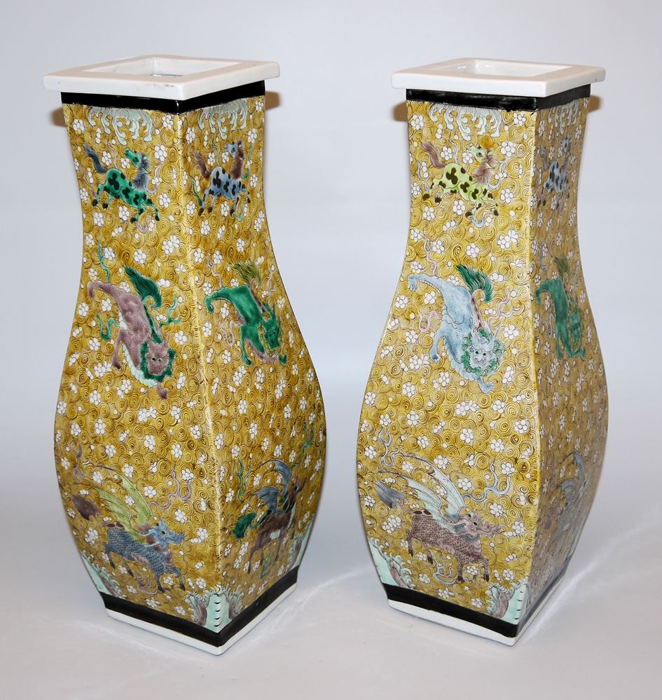 Gegenstücke zweier Porzellanvasen mit quadratischem Querschnitt, bemalt mit mythischen Kreaturen vor Voluten und Pflaumenblüten sowie einem gelben Fond, auf Boden apokryphe Kangxi-Sechszeichenmarken, Ausführung wohl Republik-Zeit, H 43 cm