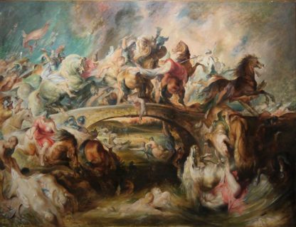 Das Werk von Rubens (1577 -1640), 1618 entstanden, zeigt dessen große Bewunderung für Leonardo da Vincis Schlacht von Anghiari, Öl auf Holz, 121 x 165,5 cm (Originalgröße), Größe mit Rahmen ca. 140 x 183 cm, auf altem graviertem Messingschild bez., im üppigen Goldstuckrahmen (r. u. Ecke etwas bestoßen)