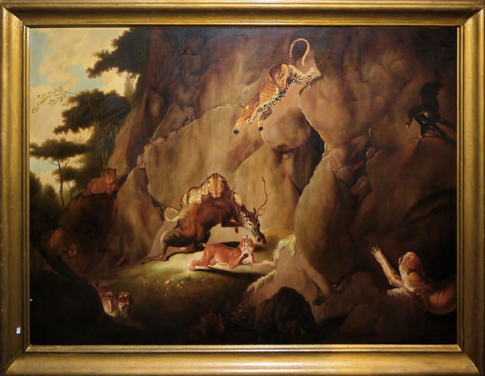 Carl Borromäus Andreas Ruthart, auch Carl Ruther und Karl Ruthard genannt; auf Italienisch als Carlo Borromeo Rutardo,1630 Danzig - ca. 1703 L'Aquila, deutscher Maler, der den größten Teil seiner Karriere in Italien verbrachte. In den letzten Lebensjahren wurde er als Fré Andrea bezeichnet. Er sah sich als Anhänger von Peter Paul Rubens, hier: In einer Felsenwand attackieren 7 unterschiedliche Raubkatzen, u.a. Tiger, Leopard, Löwe, Luchs, eine stattliche Antilope, am rechten Bildrand wartet ein Raubvogel bereits auf das bevorstehende Festmahl. Das Zentrum der Darstellung ist hell erleuchtet und unterstreicht die Dramatik des Geschehens, Öl/Lw., altdoubliert, 105 x 145 cm, im vergoldeten Holzrahmen (Gesamt: 125 x 165 cm) Veröffentlicht bei: www.1st-art-gallery.com