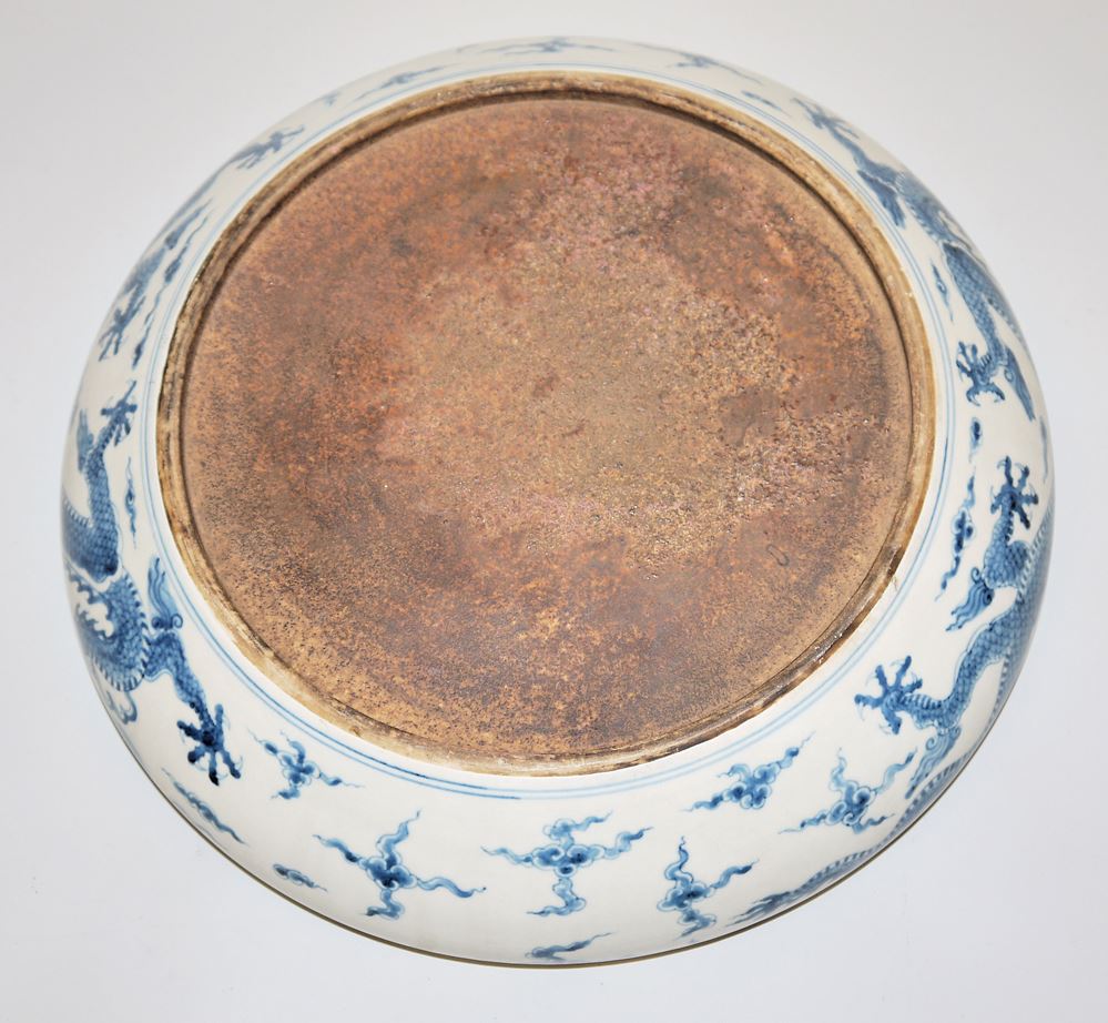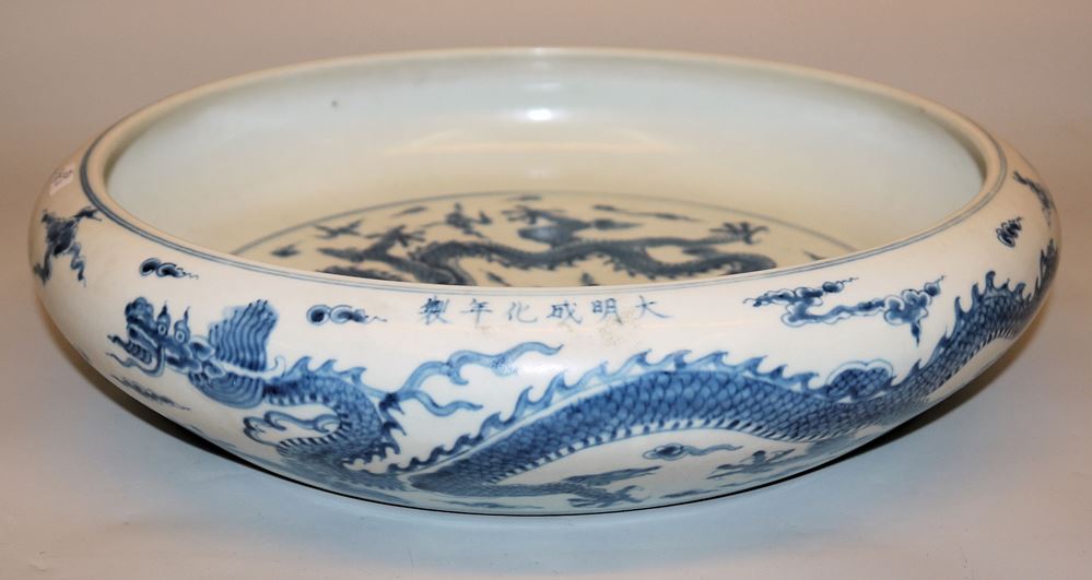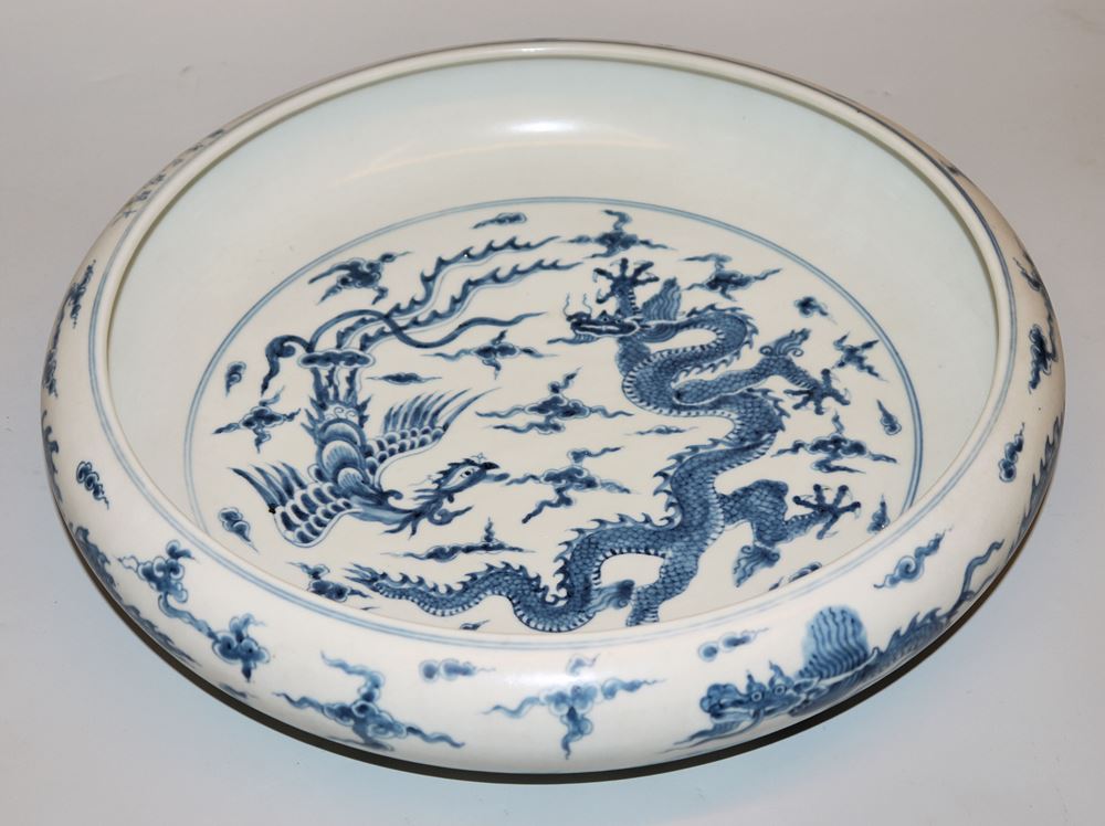 Weite Schale aus Blauweiß-Porzellan, bemalt mit Drachen-Phönix-Motiv, auf dem Rand Sechszeichenmarke des Ming-Kaisers Chenghua, nicht aus der Periode, Dm 37,5 cm, H 8,5 cm
