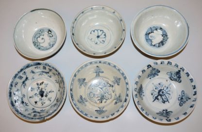 Sechs Blauweiß-Schalen und zwei Dosen der Ming-Zeit, China 15./16. Jh. Vier Porzellanschalen mit buddhistischen Glückssymbolen und stilisierten Sanskrit-Silben, zwei weitere Schalen mit Schneckenmuschel im Boden, Gebrauchs- und Altersspuren, Export-Porzellane der Chenghua/Hongzhi-Zeit (Dm ca. 14 - 15,5 cm) sowie zwei Siegellack-Dosen der Wanli-Zeit, mit Lotusteich bzw. Blütendekor, letztere durch Salzwasser stark mattiert (Dm 7 u. 9 cm)