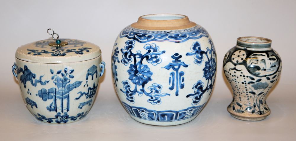 Drei Vorratstöpfe der Qing-Zeit, China 18./19. Jh. Blauweiß-Kugeltopf mit Blumendekor und Shou-Zeichen, gemarkt mit Doppelring (H 20,5 cm); Blauweiß-Deckeltopf mit Dekor aus Edlen Objekten, die Wandung in Art eines Flechtkorbes gerippt (H 16 cm) sowie ein Balustergefäß mit stilisiertem Dekor und Perlensträngen (H 16 cm)