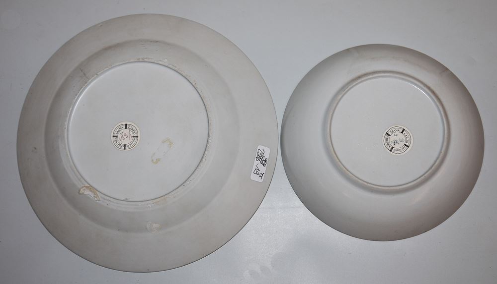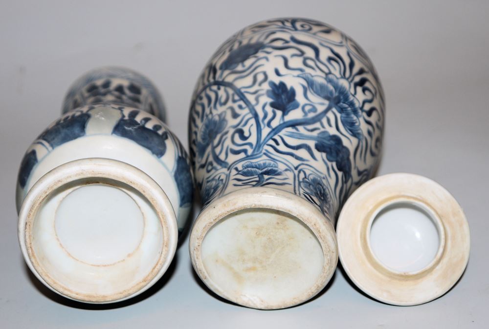 Vier Cargo-Porzellane der Qing-Zeit, China 18./19. Jh. Zwei Blauweiß-Vasen mit Blumendekor, Glasuren durch Meerwasser mattiert (H 13,2 & 15,5 cm) und zwei Teller mit Ideallandschaften (Dm 14,5 & 19,2 cm), letztere mit Etiketten der Versteigerung bei Christie´s 1995, aus dem Schiffwrack "Diana", gesunken 1817 vor der Küste Malaysias