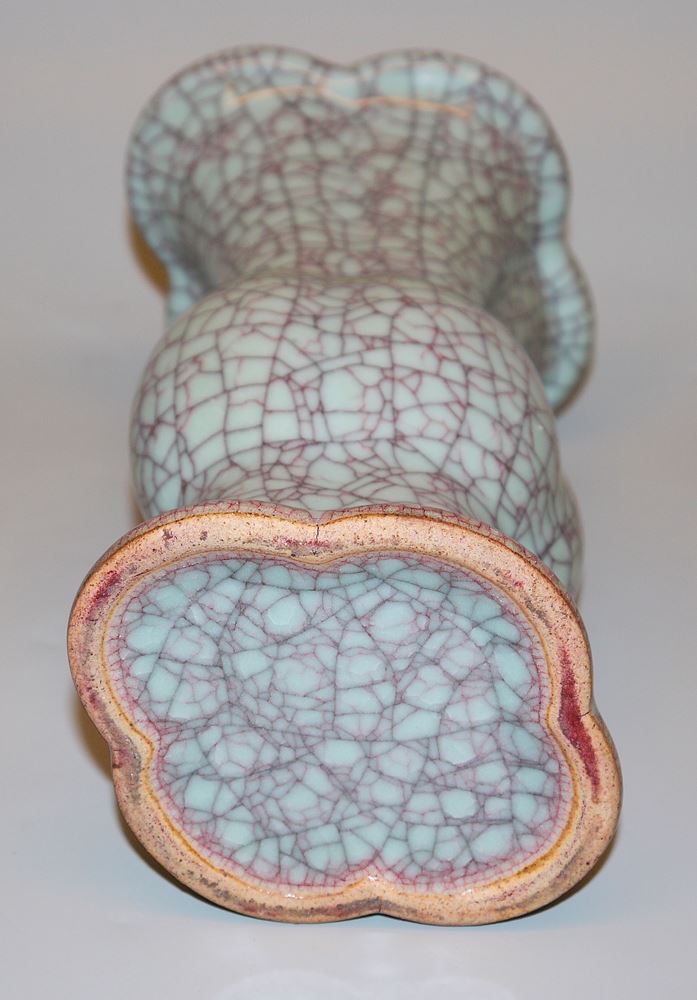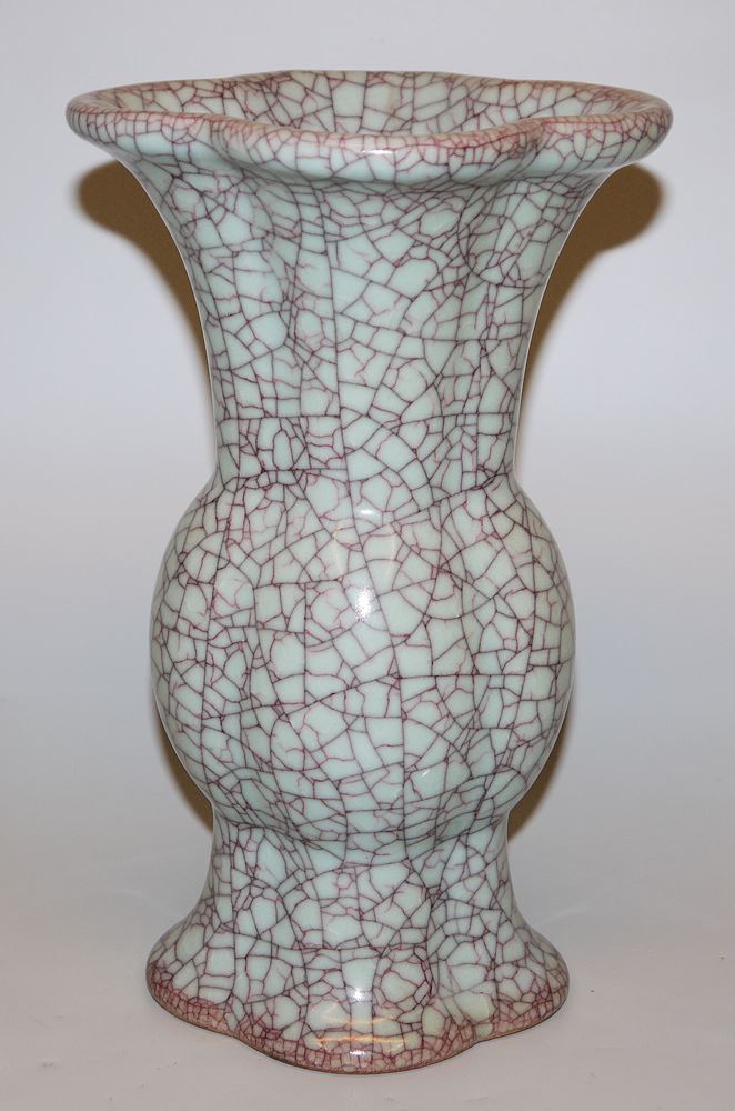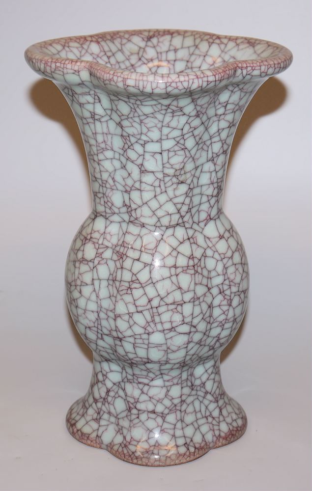 Vierpass-Vase in Art der Guan-Ware, China 19./20. Jh. Steinzeugvase in Form Gu, hellblaue Glasur mit Kunst-Craquelé nach Vorbild der Song-Zeit, ungemarkt, H 25,3 cm