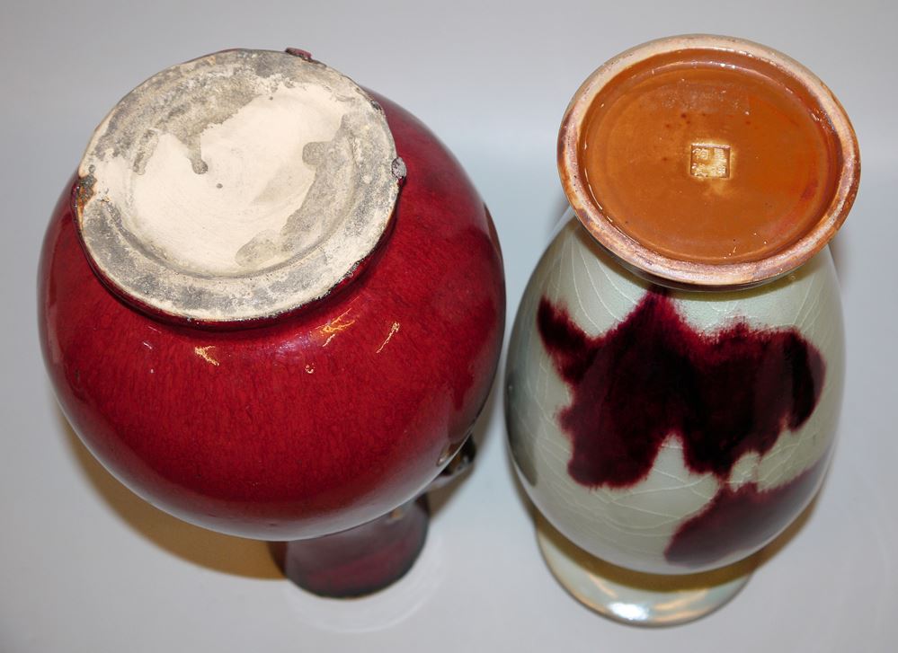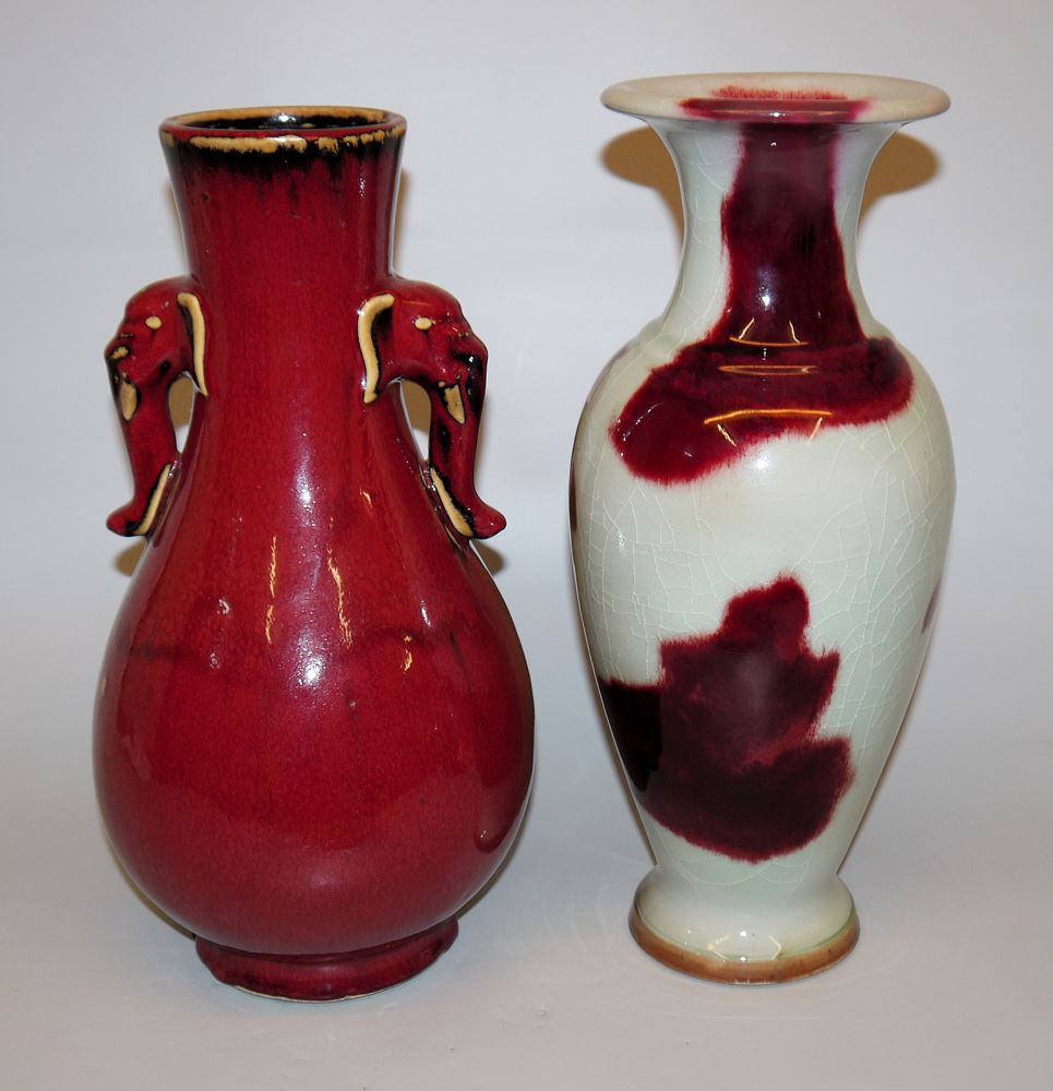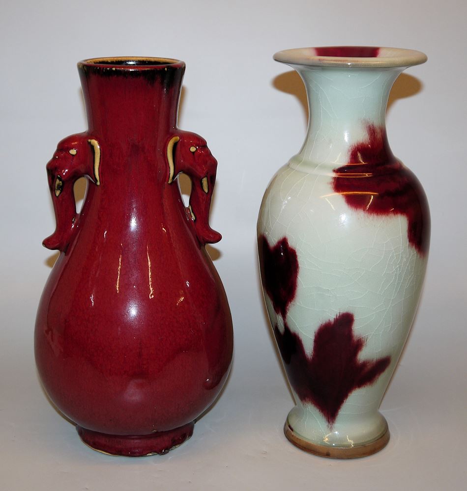 Zwei große Vasen mit "Sang de Boeuf"-Glasuren, China 20. Jh. Flaschenvase mit Elefantenkopf-Griffen, heller Steinzeug-Scherben mit "Ochsenblut"-Glasur, ungemarkt, H 35,5 cm sowie Balustervase mit Seladonglasur und großen bordeauxroten Flecken, auf Boden Manufakturmarke, H 36,5 cm