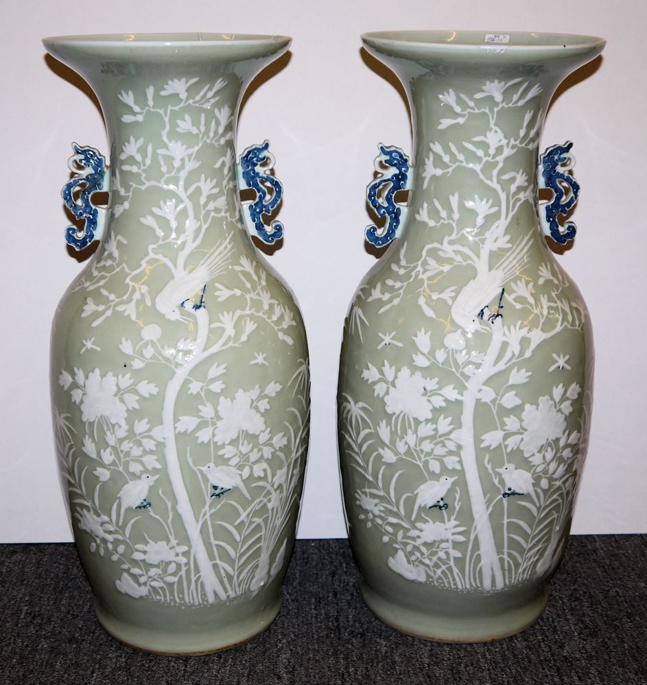 Gegenstücke zweier Balustervasen aus Porzellan, vor seladongrünem Fond ein fein reliefierter Dekor aus Vogelpaaren zwischen blühenden Pflanzen und Bambus, die Füße und Augen der Vögel blau akzentuiert, ebenso die Handhaben in Form archaischer Drachen, eine Vase in gutem Zustand, die zweite Vase an der Mündung und an einer Handhabe nach Bruch geklebt, beide ungemarkt, H 61,5 & 62 cm