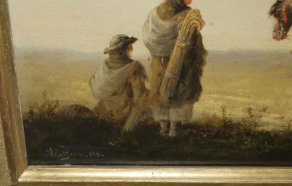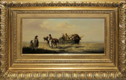 Joseph Wolfram, österreichischer Maler, tätig in Wien um 1860-1873 als Landschafts- und Genremaler, insbesondere mit ungarischen Volks- und Zigeunerszenen, tätig, hier: In einer weiten Landschaft sitzen auf einem mit Säcken beladenen Pferdefuhrwerk, das von einem Mann geführt wird, eine Frau und ein Mann in ungarischer Tracht. Am Wegesrand stehen zwei Wanderer und beobachten das Geschehen, Öl/ Lw., 20 x 48 cm, l. u. sign., in breitem Goldstuckrahmen