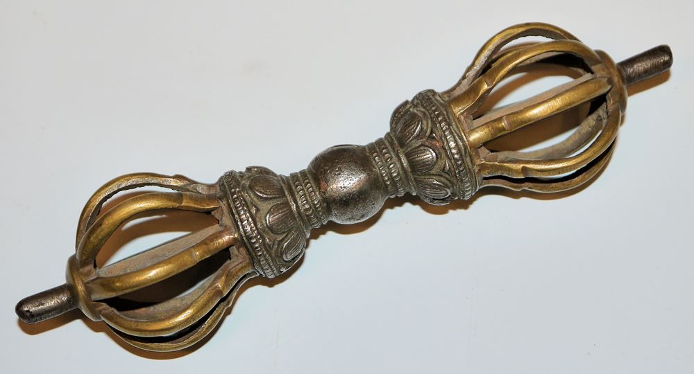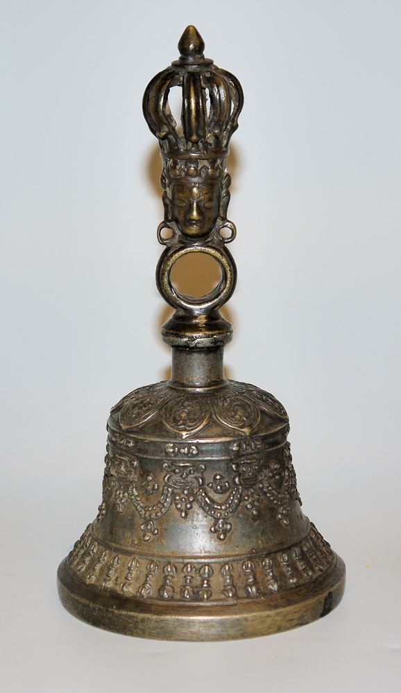 Phurba (Vajrakilaya), der Dreikant-Dolch des tantrischen Buddhismus aus goldfarbener Bronze, die Spitze aus Eisen mit Resten von Vergoldung, L 23,2 cm, drei Diamantzepter (vajra), eines mit eisernem Griffstück, L 11,5 & 17,8 cm sowie eine Glocke (ghanta), H 18 cm, alle Teile mit Patina aus rituellem Gebrauch