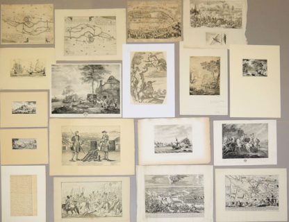 Dabei: 13 Schlacht- und Belagerungspläne, u.a. 2 "Einhanddrucke" des 17. Jhs. sowie Künstlergraphik von Jan Both (um 1618 - Utrecht - 1652), Johann Daniel Heimlich (1740 Straßbourg - 1796), Christian von Mechel (1737 Basel - 1817 Berlin), Jean Moyreau (1690-1762) nach Ph. Wouwerman, 2x Gabriel Perelle (1604-1677), dazu eine persische Handschrift des 17. Jhs.