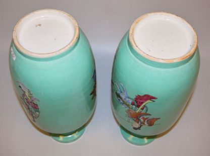 Gegenstücke zweier großer Porzellanvasen, vor türkisblauem Fond in famille rose Lan Caihe mit Blütenkorb und Löwenhund sowie weitere daoistische Unsterbliche und ein Schmetterling, beide ungemarkt und in gutem Zustand, H 39,3 cm