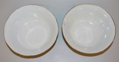 Gegenstücke zweier Schalen mit leicht gewellten, vergoldeten Rändern, die Außenwandungen mit unterschiedlichen Szenen aus der „Alten Höhle des Weißen Hirsches“ bemalt, durch umseitige Inschriften benannt, auf Boden Marken des Kaisers Daoguang-Marke in Eisenrot, beide Schalen intakt, H 8 cm, Dm 17,2 & 18 cm