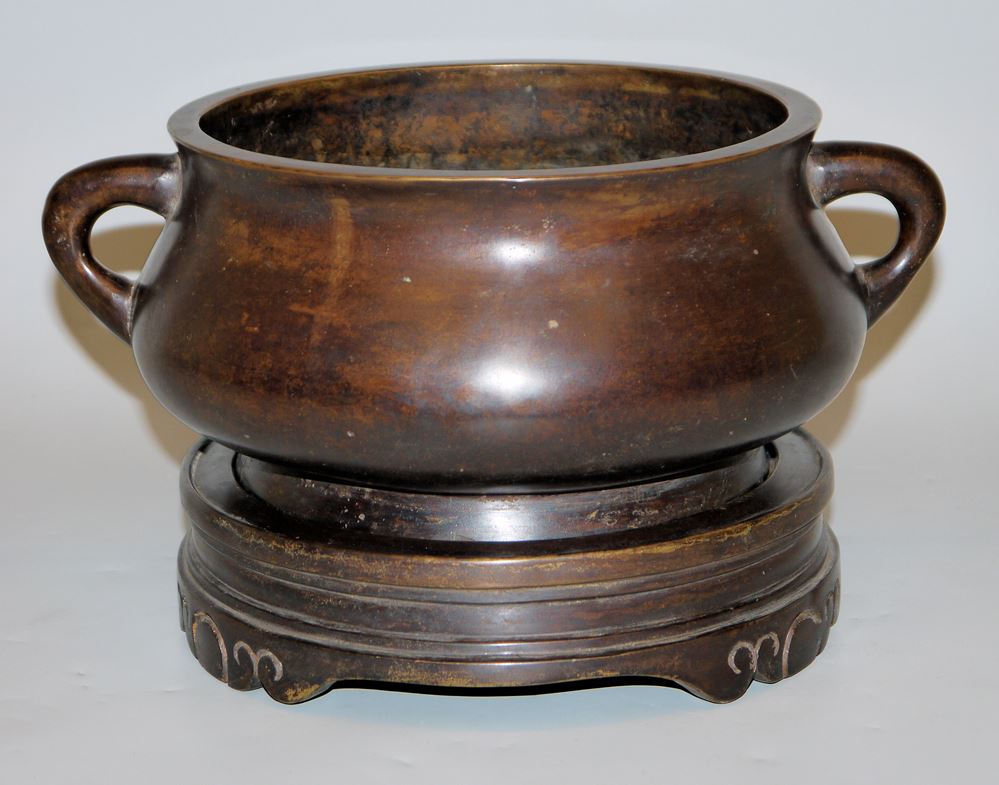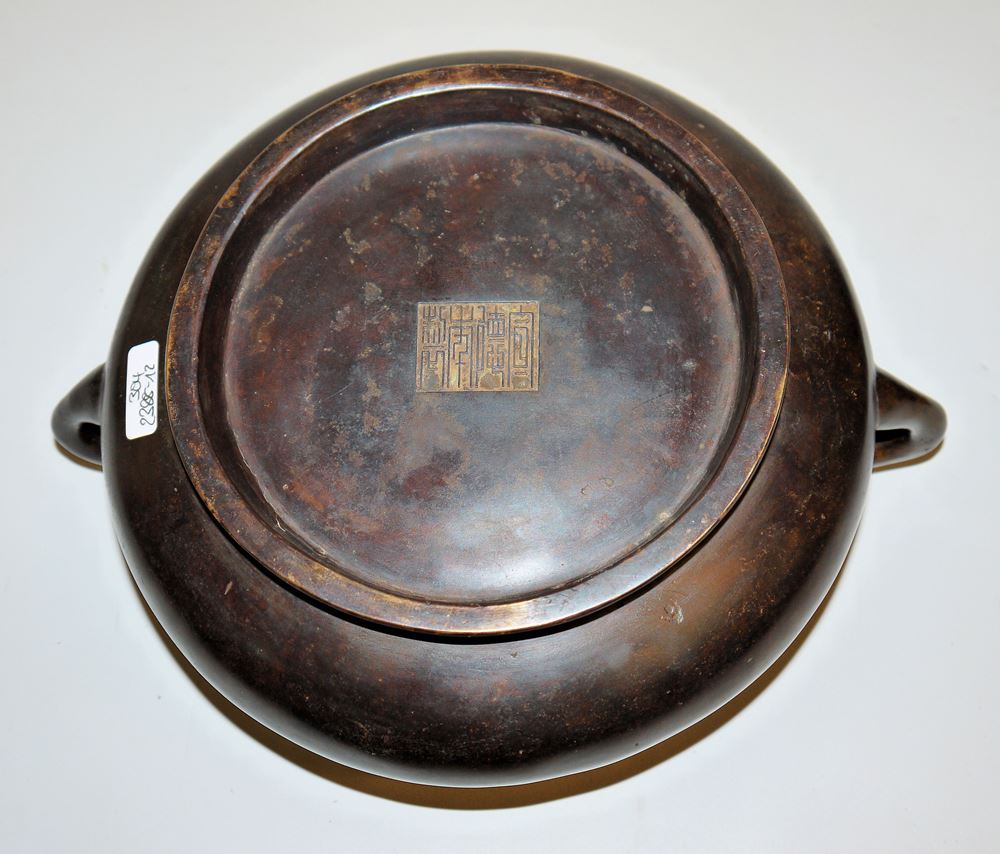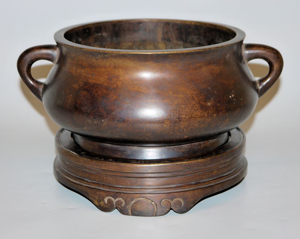 Geschweiftes Bronzebecken mit Ohrenhenkeln, unterseitig gemarkt Xuande in Siegelschrift, Gew. 3496 gr (H 10,2 cm, Dm 20,5 cm), mit zugehörigem Bronzesockel, Gew. 1953 gr (H 4,7 cm, Dm 19,3 cm)