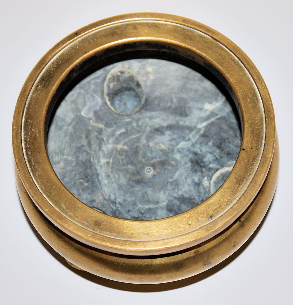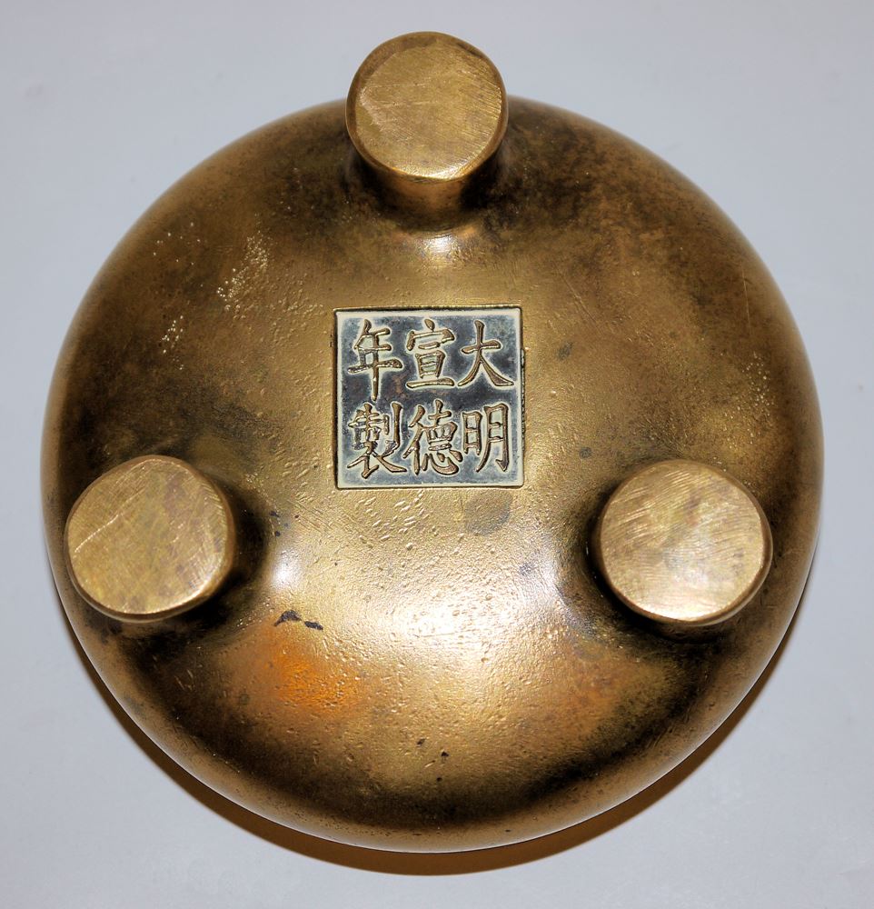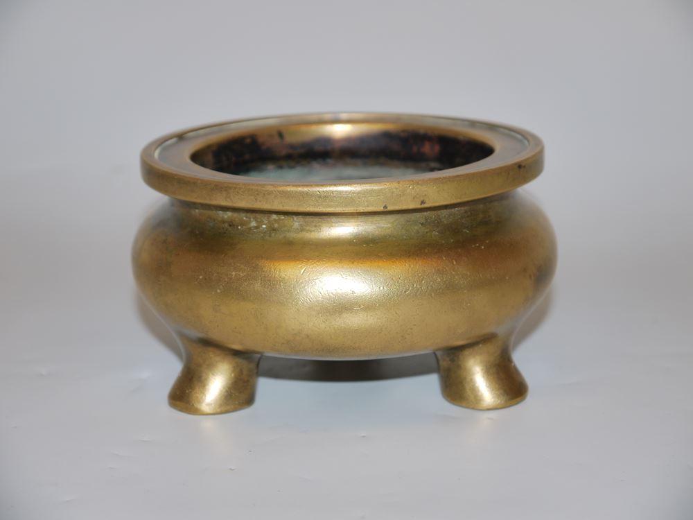 Dreifuß-Räucherbecken aus goldfarbener Bronze, Qing-Zeit, China 19. Jh. Gedrungener Weihrauchbrenner mit abgekanteter Randzone, auf Boden Xuande-Sechszeichenmarke, Gew. 1118 gr, Dm 12,5 cm, H 7 cm