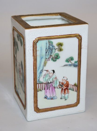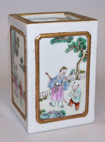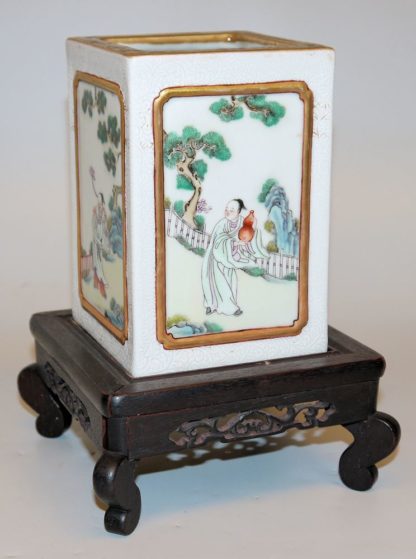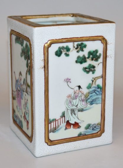 Pinselbecher aus Sgraffito-Porzellan, allseitig Bildfelder mit daoistischen Unsterblichen, fein gemalt in famille rose, auf Boden Sechszeichenmarke des Kaisers Jiaqing, mit passendem Holzsockel, H ohne Sockel 12,7 cm
