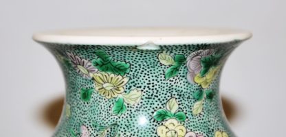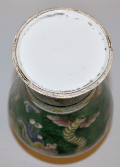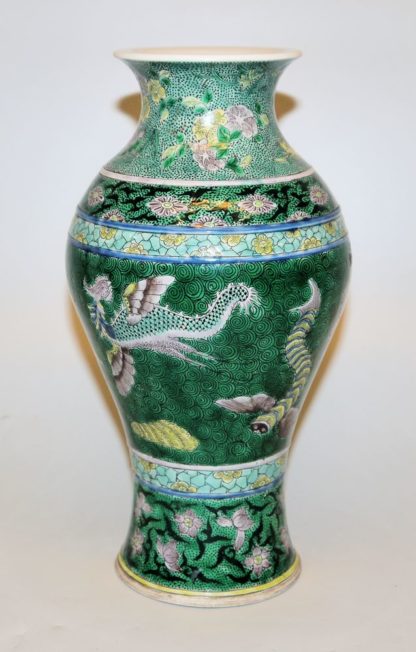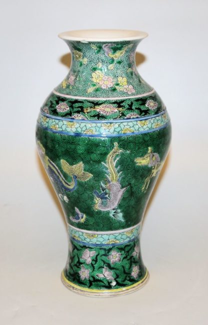 Porzellanvase aus Jingdezhen, in famille verte bemalt mit fantastisch verfremdeten Tieren des Wassers und der Luft sowie umlaufenden Friesen aus "gebrochenem Eis" und Blütenschmuck, ein kleiner unterseitiger Chip an der Mündung, ungemarkt, H 23,9 cm