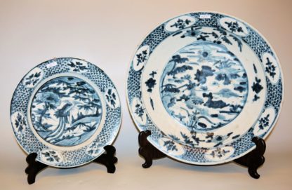 Sehr großer Teller mit stilisierten Tieren in Landschaft (Dm 40 cm) sowie kleinerer Teller mit Phönix zwischen Blühpflanzen (Dm 28 cm), die Fahnen mit Schuppenmuster und Blumenreserven, Exportporzellan aus Zhangzhou, beide intakt