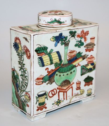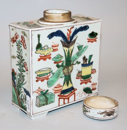 Wucai-Teedose mit Antiquitäten-Dekor, Qing-Zeit, China 18. Jh.
