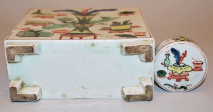 Quaderförmige Porzellandose, in den Farben der Wucai-Palette bemalt mit Bogu (wertvollen Antiquitäten), auf den Schmalseiten Blumen und Schmetterlinge an Felsen, mit originalem Porzellandeckel, 16 x 13,8 x 6 cm