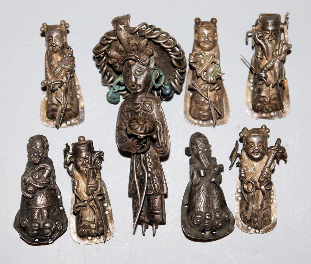 Acht figürliche Hutornamente aus Silber der Qing-Zeit, China 18./19. Jh. Sieben kleine Figuren der daoistischen Unsterblichen (H ca. 3 cm) und eine größere Figur (H 6,5 cm), fein gestaltete Silber-Applikationen als Schutzornamente an Kopfbedeckungen, besonders für die "Tigerkopf-Mützen" der Knaben
