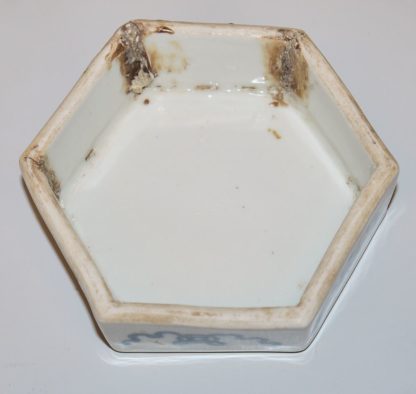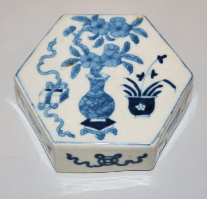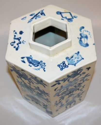 Hexagonales Porzellangefäß mit originalem Deckel, allseitig glücksverheißende Pflanzen-Arrangements in Vasen, auf der Schulter edle Objekte, ungemarkt, wohl Kangxi-Zeit, H 28,5 cm