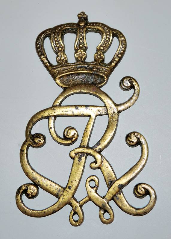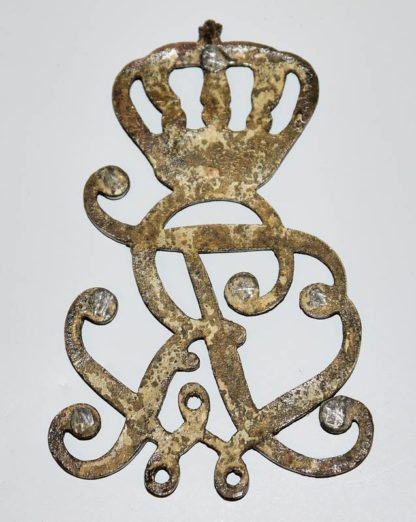 Massive Messing-Chiffre "FWR" mit Krone, die Halteösen abgefeilt, schöner ungereinigter Sammlerzustand, 10,9 x 7 cm