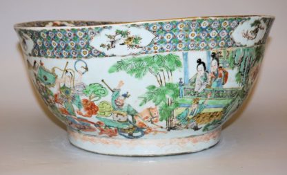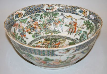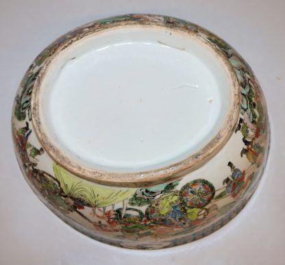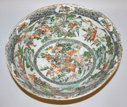Ovales Becken mit feiner Malerei kämpfender Reiter und Fußsoldaten in den Farben der famille verte sowie reicher Brokatmusterung, ein Haarriss mit kleiner Scharte in der Wandung, Dekor gebrauchsbedingt stellenweise etwas berieben, ungemarkt, 16 x 34 x 30 cm
