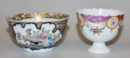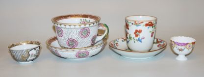 Ein Koppchen der chinesischen Yongzheng-Zeit (1723-1736) (Dm 7,4 cm); eine tiefe Teeschale mit Untertasse, China 18. Jh. (H 8 cm, Dm 13,8 cm), eine Tasse mit perforierter Doppelwandung und Untertasse, "Prince of Wales"-Serie von Herend, Ungarn, gemalte Manufakturmarke um 1900 (H 7,5 cm) sowie ein Eierbecher mit apokrypher Schwertermarke, wohl Samson, Paris (H 4,6 cm)