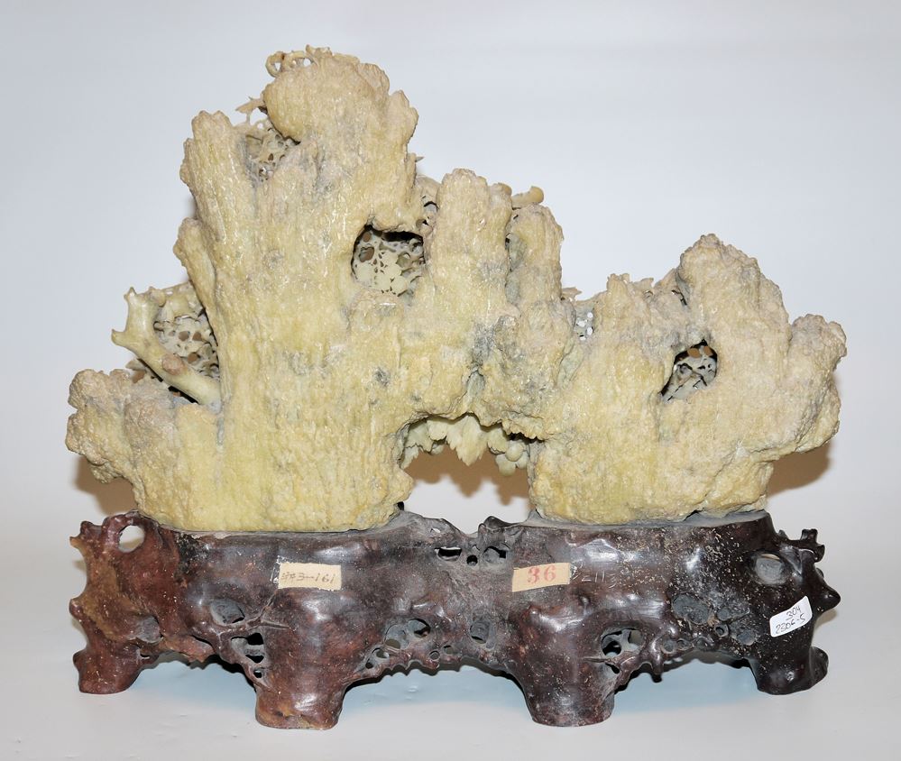 Üppige Traubenhenkel und filigranes Blattwerk ranken sich um eine raue Felsfomation, dazwischen zwei springende Eichhörnchen, geschnitten aus gelbgrüner Variante des Specksteines von Shoushan (Agalmatolith), auf einem braunen Sockel aus Wurzelgeflecht, meisterhafte Arbeit mit alter Sammlungsnummer