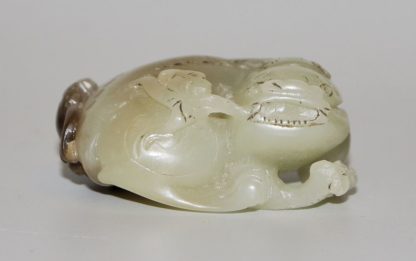 Das geduckte Raubtier mit einem Lingzhi-Pilz im Maul, auf seinem Rücken ruht die Fledermaus, geschliffen aus zartgrünem Nephrit mit brauner Einsprengung, L 5 cm