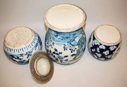 Große Porzellan-Urnenvase mit Haubendeckel, bemalt mit Fasanenpaar an Felsen und Päonien (H 46 cm); gedrungen bauchige Topfvase im Stil der Ming-Zeit, bemalt mit Wassertieren, Vögeln und Blumen (H 20,5 cm) sowie ein Vorratstopf mit Vasen und Glücksmotiven in Schaureserven, der tiefblaue Fond mit Pflaumenblüten (h 21 cm), alle Teile ungemarkt und intakt